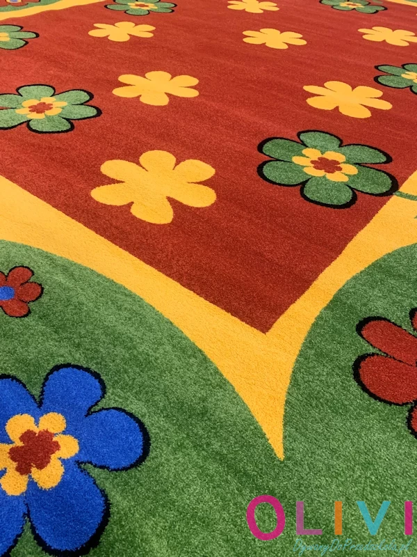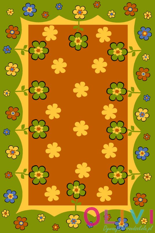 Dywan Łączka Zielony przenosi dzieci w spokojny świat natury, na łąkę pełną kwiatów, kolorów i harmonii. Terakotowe tło w centrum dywanu wprowadza ciepło i przytulność, a zielona rama symbolizuje trawę i naturalne granice przestrzeni. Choć wzór jest lekki i łąkowy, kryje w sobie wyraźny porządek, który sprzyja koncentracji.