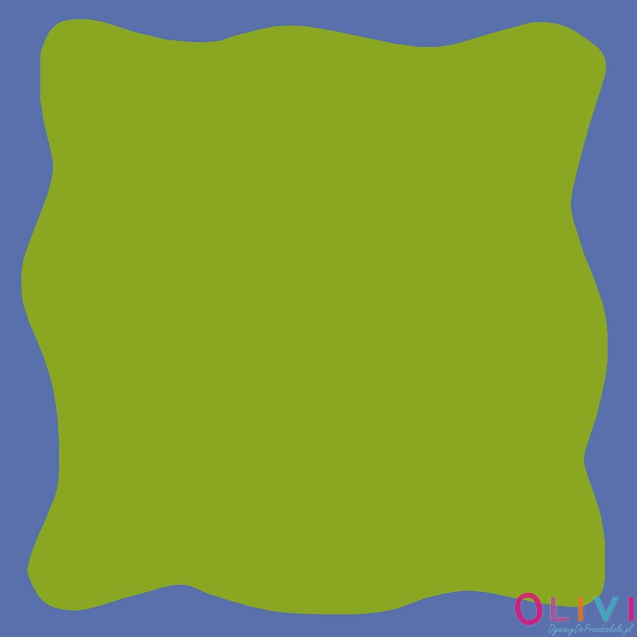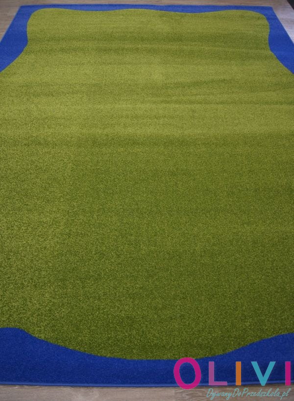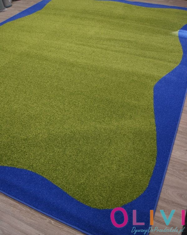 Dywan Ramka Zielony to niemal jednolita, zielona przestrzeń otoczona subtelną falującą niebieską ramą. Dywan prosty w formie, a jednocześnie bardzo sugestywny wizualnie. Przywołuje skojarzenia z łąką, polaną lub spokojnym fragmentem natury, na którym wszystko może się wydarzyć. To dywan, który w sali przedszkolnej nie narzuca tematu, ale otwiera miejsce na pomysły dzieci i nauczyciela.