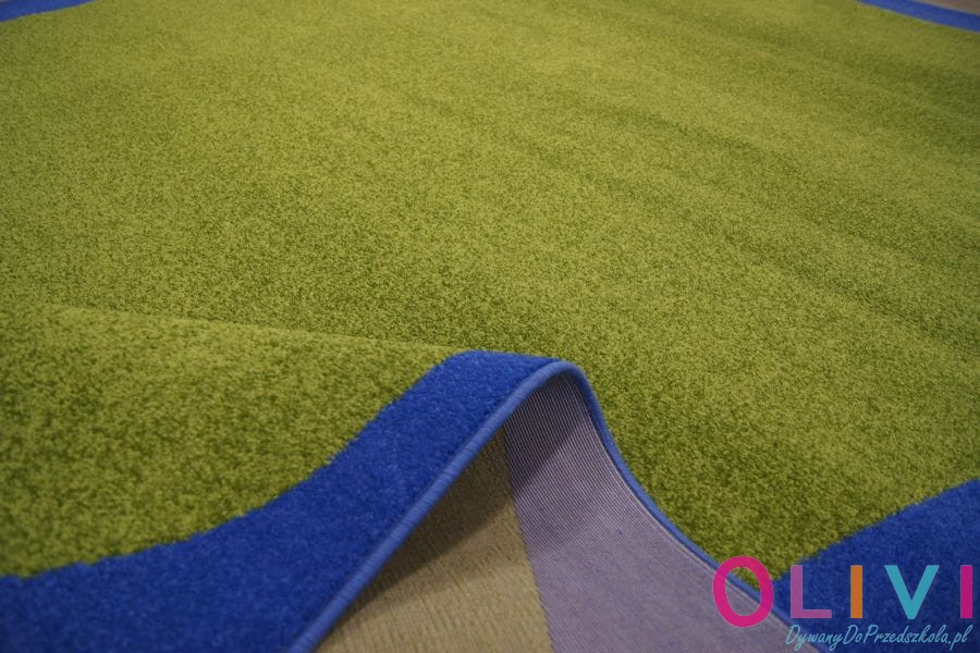 - Motyw dywanu: jednolita zielona przestrzeń ograniczona subtelną niebieską ramą