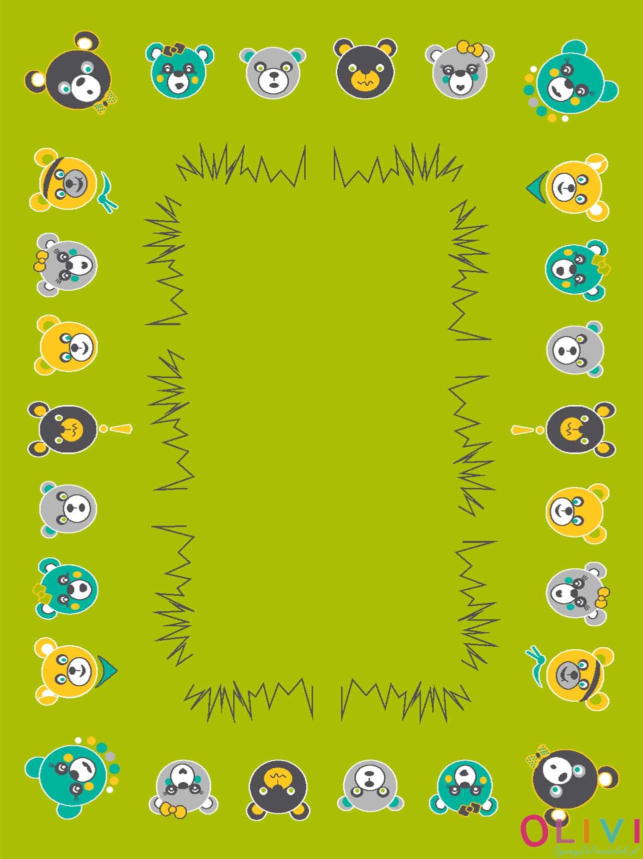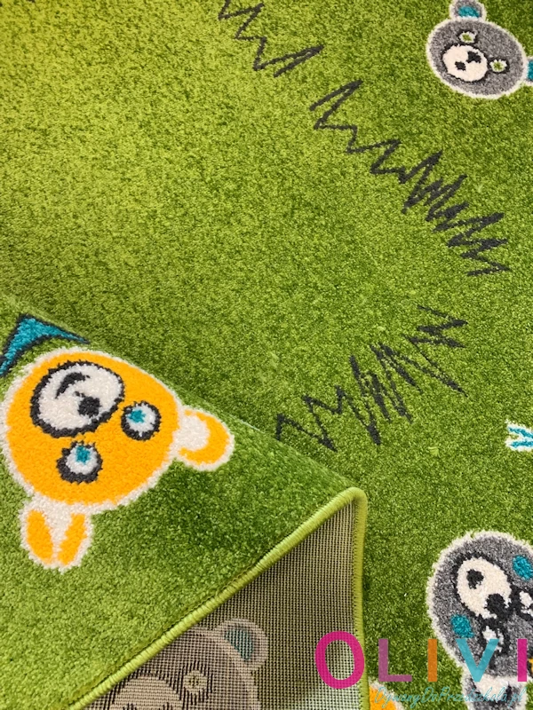 Dywan Misiaczki Zielony to zielona harmonijna dekoracja sali. Wzór może wspierać zajęcia tematyczne, integrację i kreatywną zabawę. Polski produkt z aktualnej kolekcji Olivi jest dostępny wyłącznie w sklepie należącym do Olivi dywany do przedszkola.