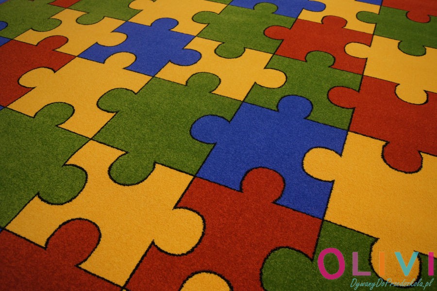 - Motyw dywanu: Kolorowe puzzle ułożone na całej powierzchni dywanu tworzące układankę