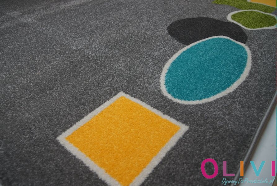 Dywan Figury Szary to uniwersalna dekoracja sali. Może stanowić tło codzienności. Wzór dywanu dziecięcego nie zaburza przestrzeni i nie rozprasza. Wprowadza subtelny motyw edukacyjny. Ten polskiej produkcji dywan jest autorskim projektem firmy Olivi dywany do przedszkola i możesz go zakupić w naszym sklepie.