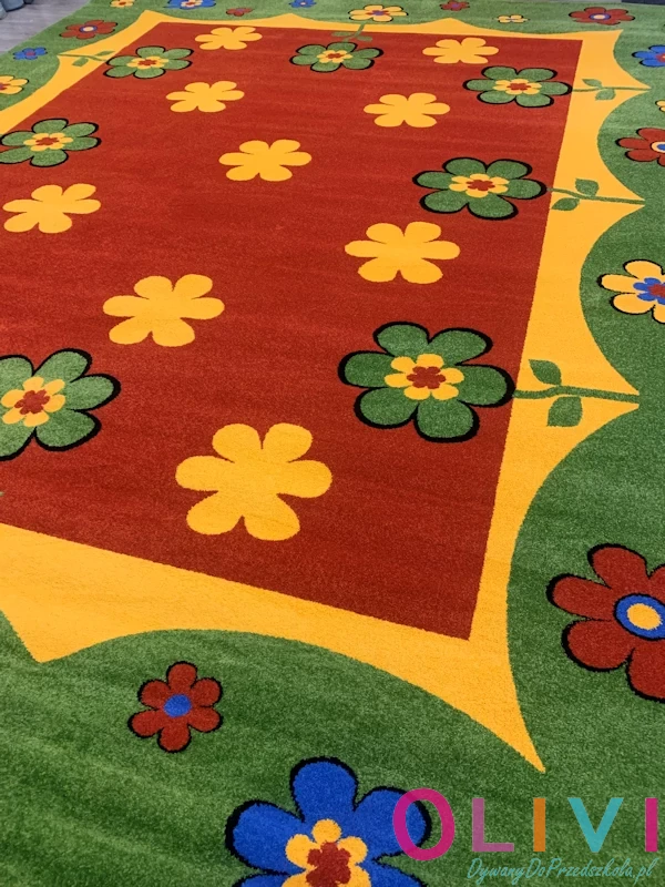 Dywan Łączka Zielony przenosi dzieci w spokojny świat natury, na łąkę pełną kwiatów, kolorów i harmonii. Terakotowe tło w centrum dywanu wprowadza ciepło i przytulność, a zielona rama symbolizuje trawę i naturalne granice przestrzeni. Choć wzór jest lekki i łąkowy, kryje w sobie wyraźny porządek, który sprzyja koncentracji.