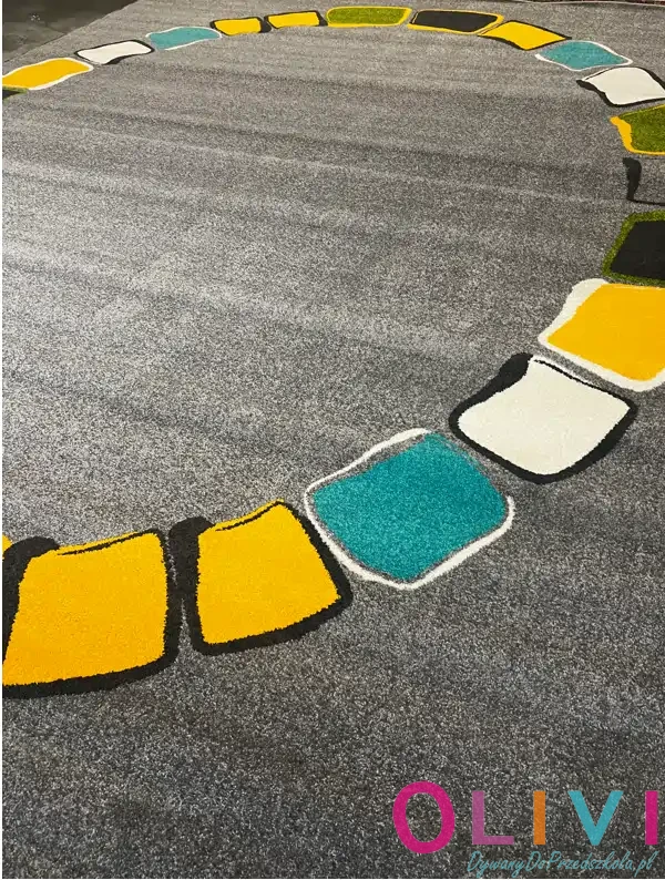 Dywan do szkoły i przedszkola Ognisko to spokojna, a zarazem uporządkowana przestrzeń, która od razu kojarzy nam się byciem razem i tworzeniem wspólnej atmosfery bliskości, co jest przecież niezwykle pożądane w każdym przedszkolu. Kolorowe elementy niczym kamienie ułożone w krąg na jednolitym, szarym tle tworzą miejsce spotkań, rozmów i codziennych rytuałów.