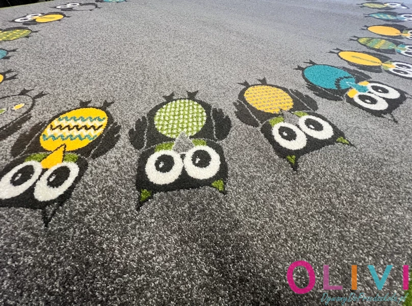 Dywan OWL 26 Szary to dekoracja sali gdzie Sówka staje się niejako towarzyszem przedszkolnej codzienności. Sówki kojarzą się z mądrością i spokojem - budują przyjazne środowisko. Polski produkt z aktualnej kolekcji Olivi jest dostępny wyłącznie w sklepie należącym do Olivi dywany do przedszkola.