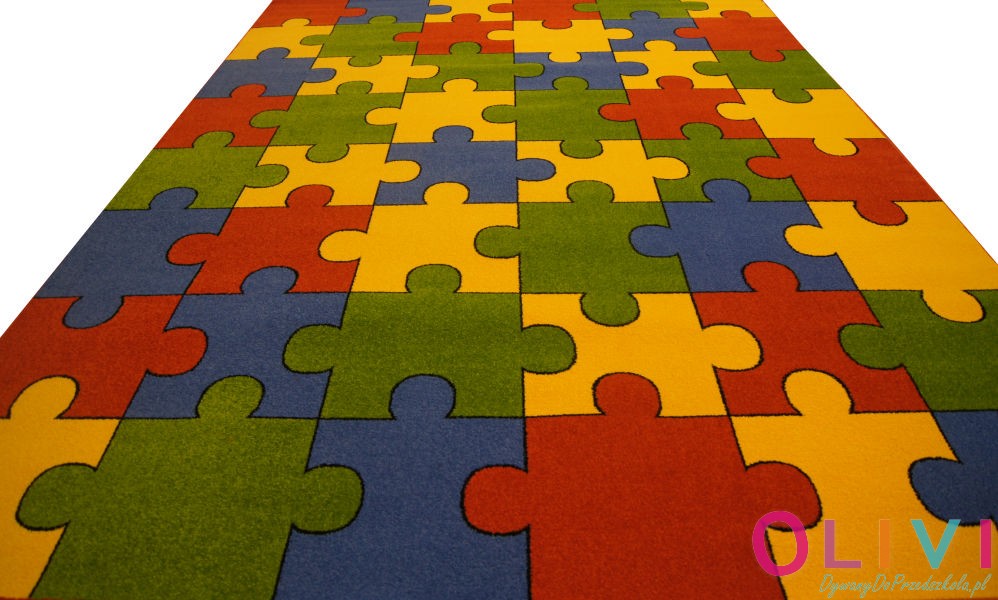 - Motyw dywanu: Kolorowe puzzle ułożone na całej powierzchni dywanu tworzące układankę