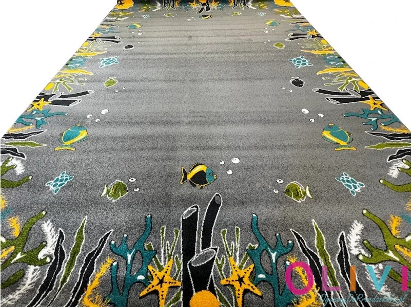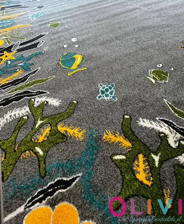 Dywan Rafa to dekoracja sali z bogatym motywem roślinnym i wodnym. Polski produkt z aktualnej kolekcji Olivi jest dostępny wyłącznie w sklepie należącym do Olivi dywany do przedszkola.