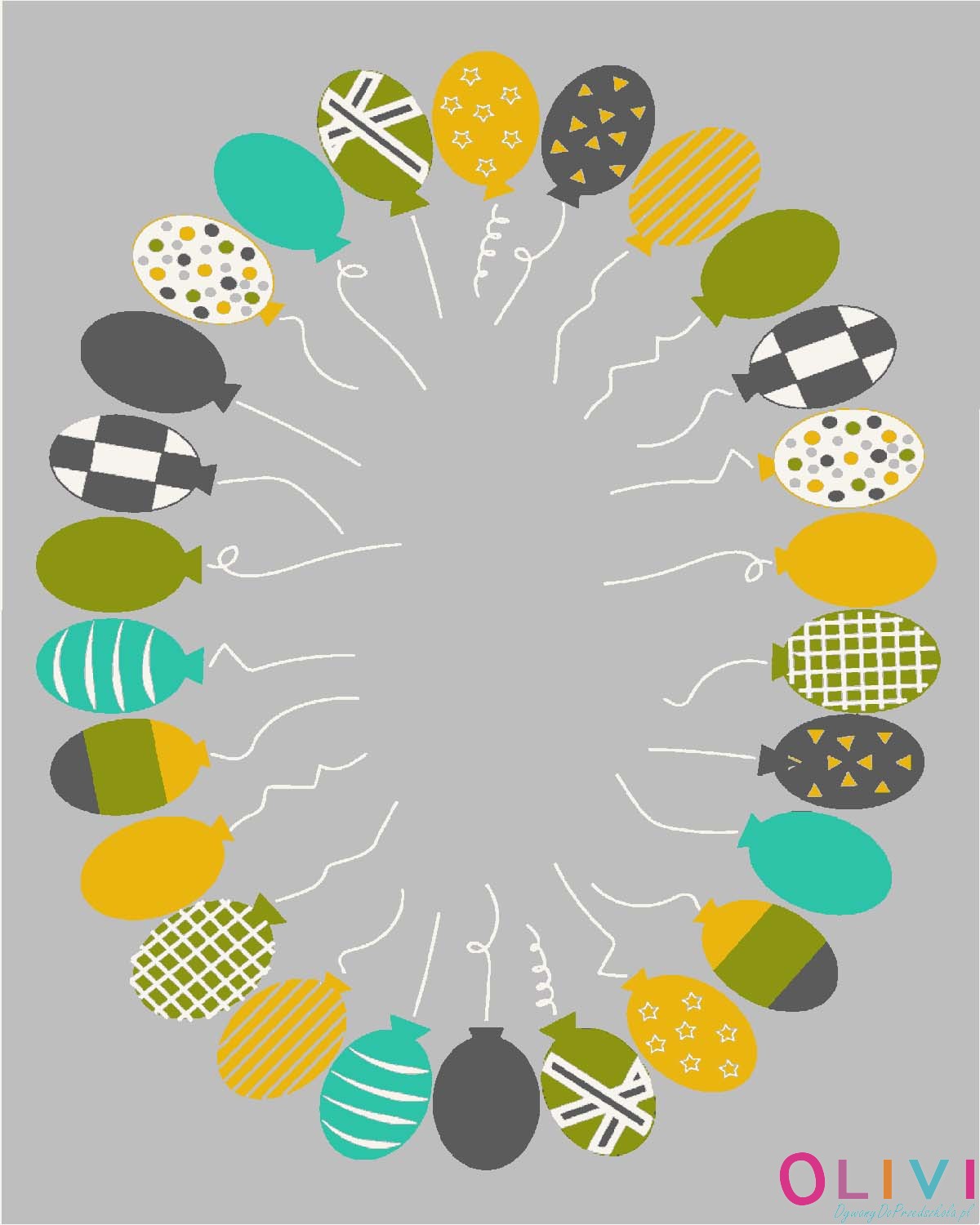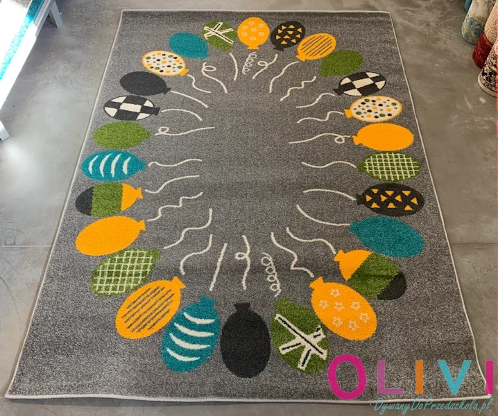 Dywan Balony 26 Szary to dekoracja sali gdzie balon może posłużyć jako metafora emocji, marzeń, relacji czyli idealne narzędzie do rozmów wychowawczych i bajkoterapii. Polski produkt z aktualnej kolekcji Olivi jest dostępny wyłącznie w sklepie należącym do Olivi dywany do przedszkola.