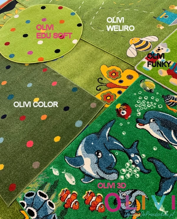 Dywan Kotki Zielony to ciepła, delikatna i funkcjonalna dekoracja sali. Polski produkt z aktualnej kolekcji Olivi jest dostępny wyłącznie w sklepie należącym do Olivi dywany do przedszkola.