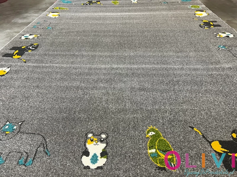Dywan Pupile to dekoracja sali z motywem bliskim i przyjaznym dzieciom. Wzór dywanu ze zwierzątkami domowymi jak piesek, kotek, papużka, rybka, może stać się inspiracją do rozmów o opiece, empatii i emocjach. Polski produkt z aktualnej kolekcji Olivi jest dostępny wyłącznie w sklepie należącym do Olivi dywany do przedszkola.